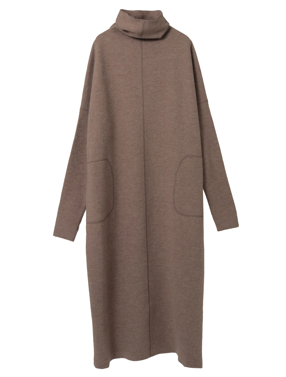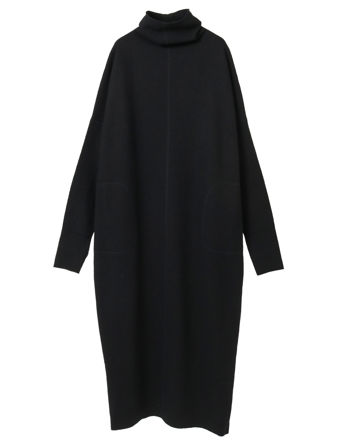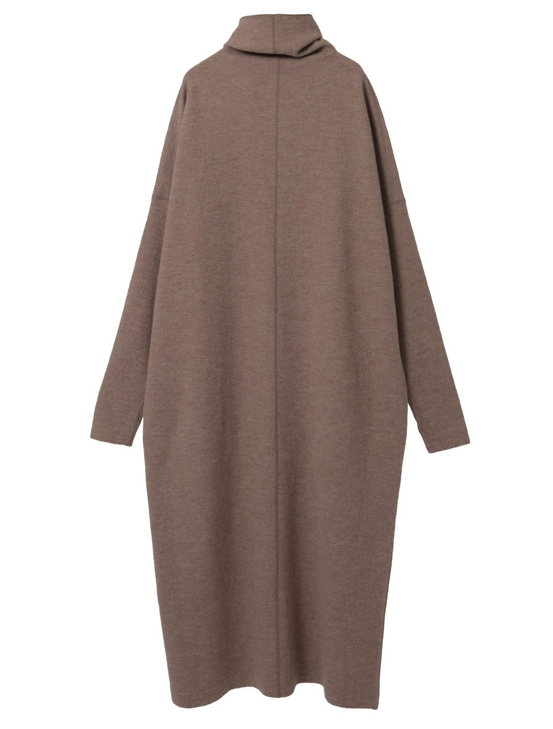 ニット編地を圧縮加工しカット縫製した手の込んだ仕様です。17,5マイクロンという非常に細く滑らか、バルキー性のある温かみのあるセミ梳毛の糸は圧縮加工をしても硬くならず柔らかな風合いを生み出すことができます。ポコポコとした表面感、適度なハリと柔らかさのバランスにこだわって圧縮仕上げをしています。ゆったりとしたシルエットのロングワンピース。平面的なパターンですが体を通すとドレープが生まれます。ワイドな身頃に対して袖は細く長めに設計し、メリハリをつけています。たっぷりした分量感があっても重さを感じないように。他のアイテムよりハイゲージの編地を圧縮し軽く仕上げています。