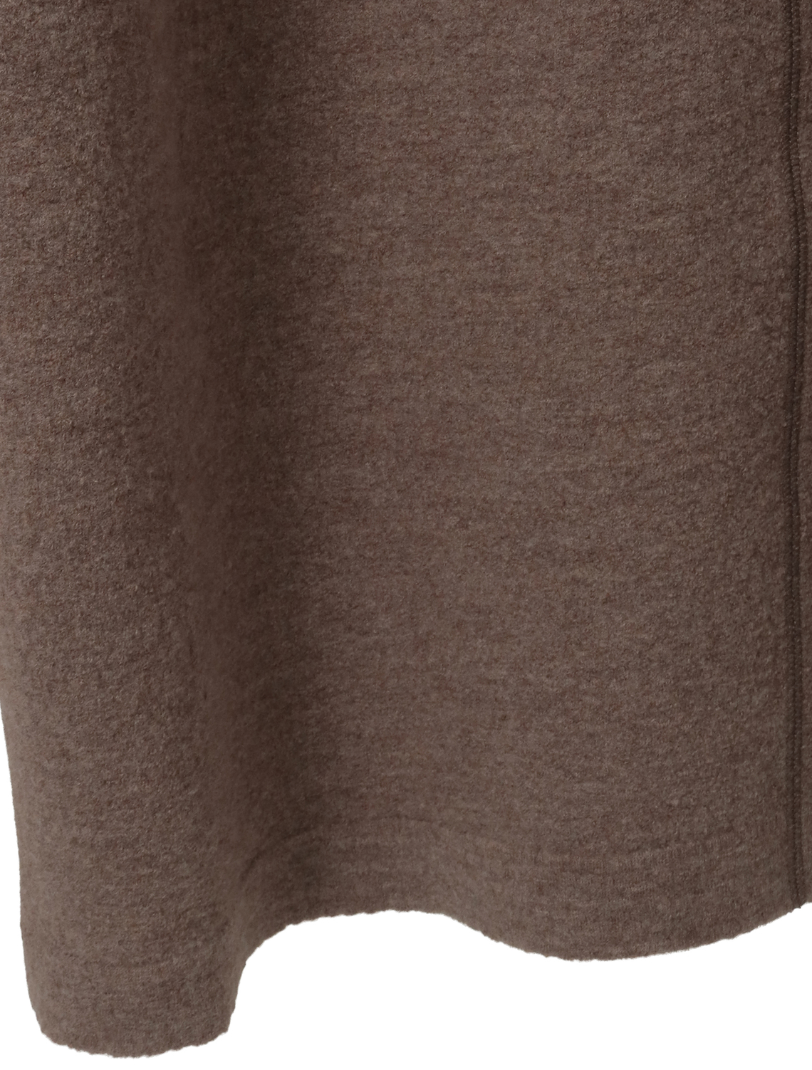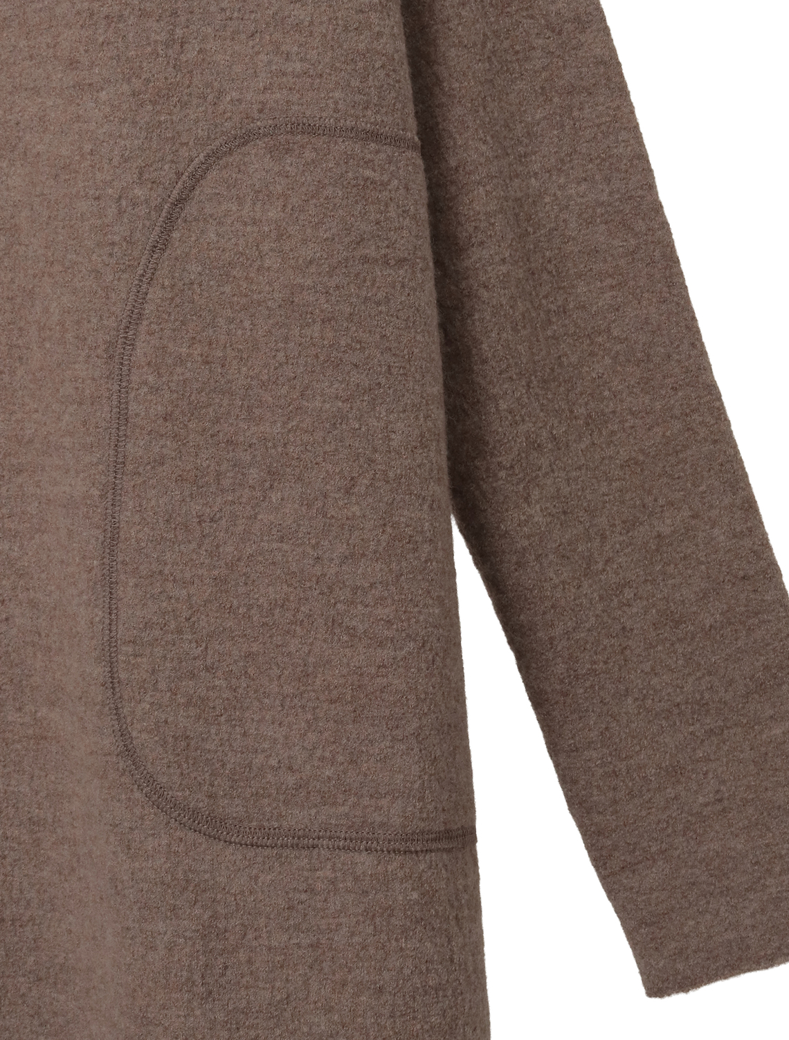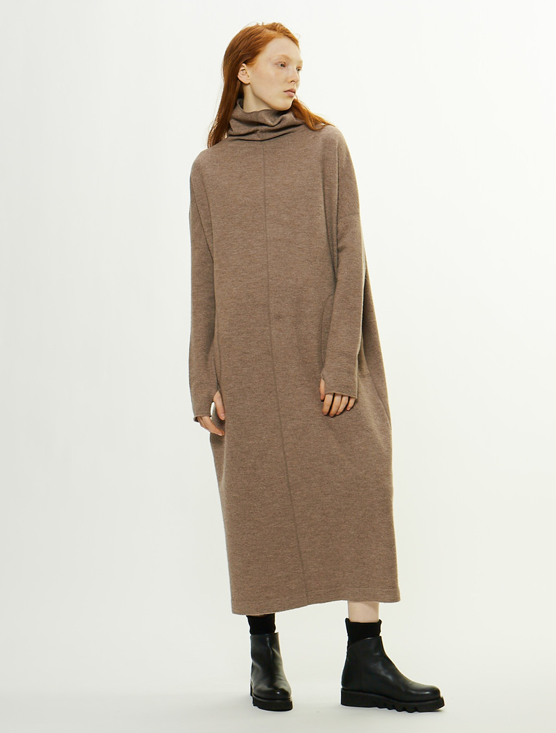 ニット編地を圧縮加工しカット縫製した手の込んだ仕様です。17,5マイクロンという非常に細く滑らか、バルキー性のある温かみのあるセミ梳毛の糸は圧縮加工をしても硬くならず柔らかな風合いを生み出すことができます。ポコポコとした表面感、適度なハリと柔らかさのバランスにこだわって圧縮仕上げをしています。ゆったりとしたシルエットのロングワンピース。平面的なパターンですが体を通すとドレープが生まれます。ワイドな身頃に対して袖は細く長めに設計し、メリハリをつけています。たっぷりした分量感があっても重さを感じないように。他のアイテムよりハイゲージの編地を圧縮し軽く仕上げています。