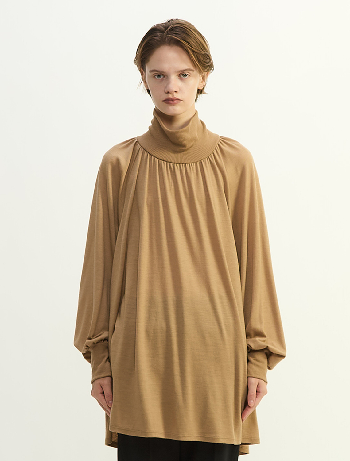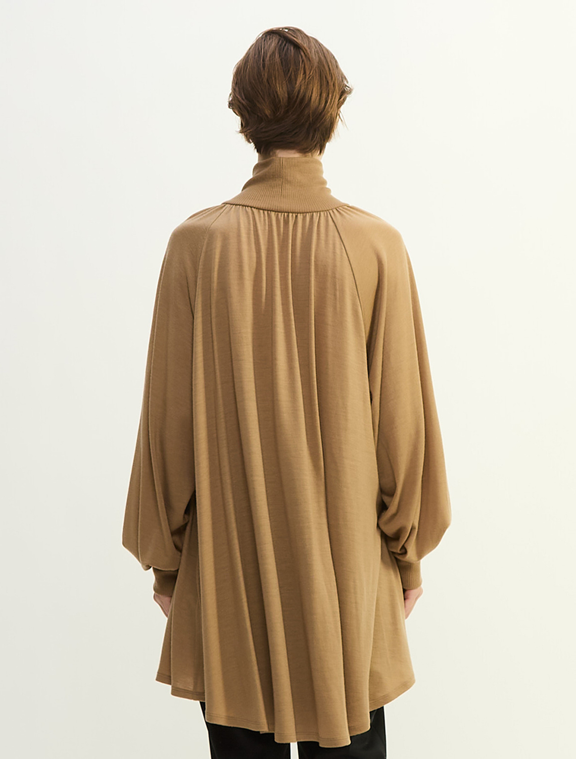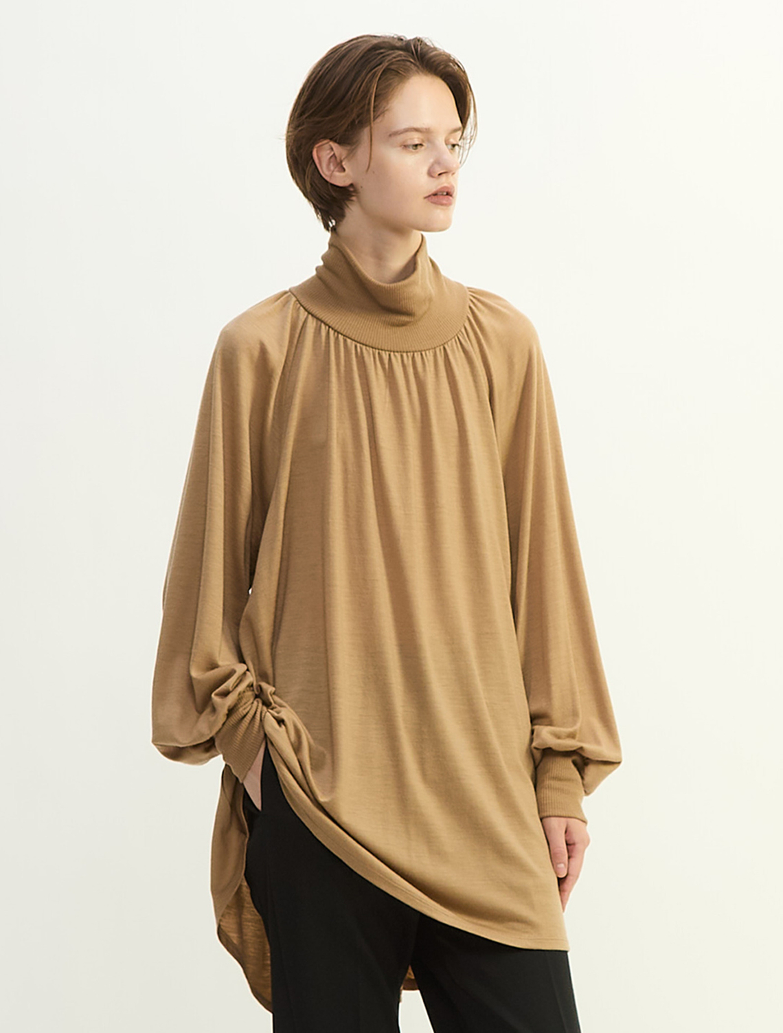 プレインピープル定番の素材、きめ細やかでコンパクトな表情のウールジャージです。フレアシルエットのチュニック。衿元から入るギャザーで華やかな印象です。細身シルエットのボトムが好相性。