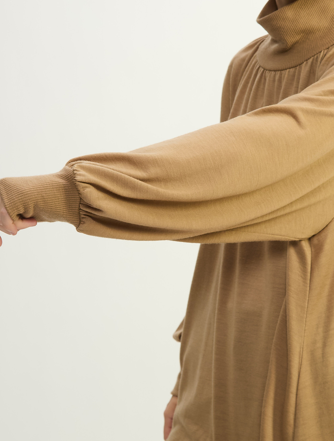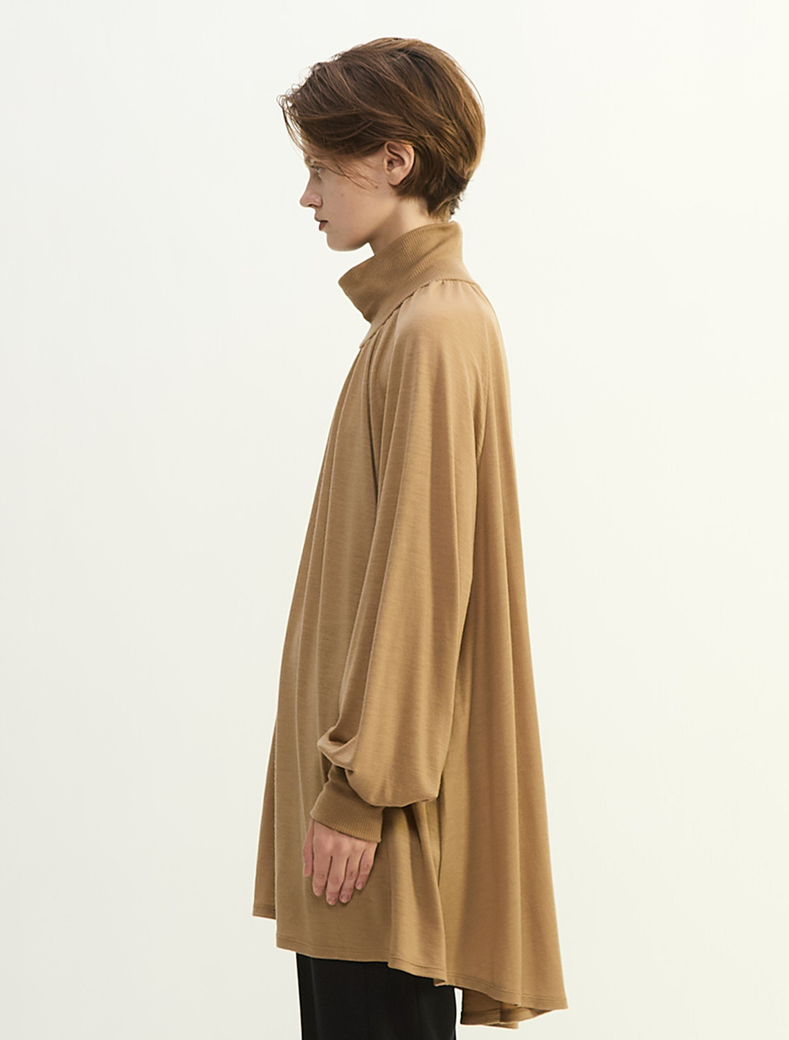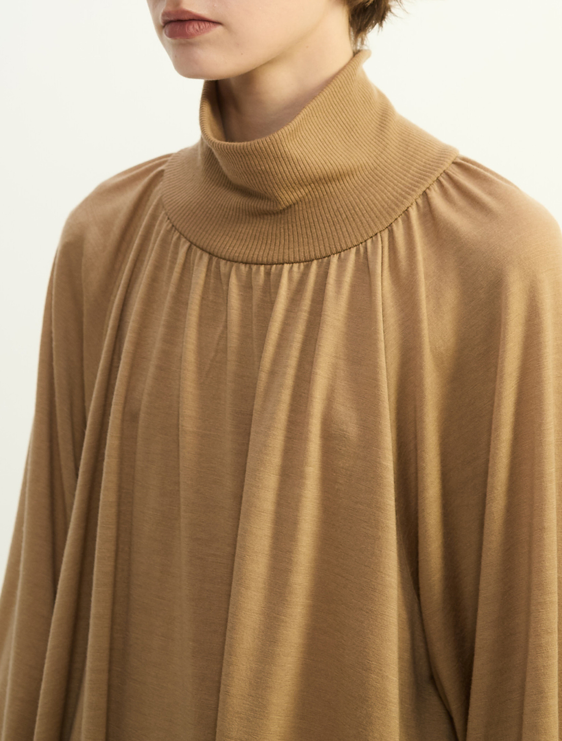 プレインピープル定番の素材、きめ細やかでコンパクトな表情のウールジャージです。フレアシルエットのチュニック。衿元から入るギャザーで華やかな印象です。細身シルエットのボトムが好相性。
